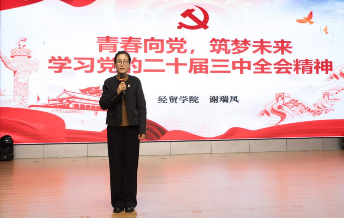 最后,谢瑞凤指出,党的二十届三中全会为青年指明了方向,经贸学院的青年学子们要牢记嘱托,以青春之我、奋斗之我,在实现中华民族伟大复兴的征程中谱写更加绚丽的青春华章。让我们青春向党,筑梦未来,在新时代的广阔天地中绽放光彩,为党和国家的事业发展贡献源源不断的青春力量。