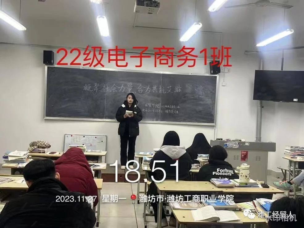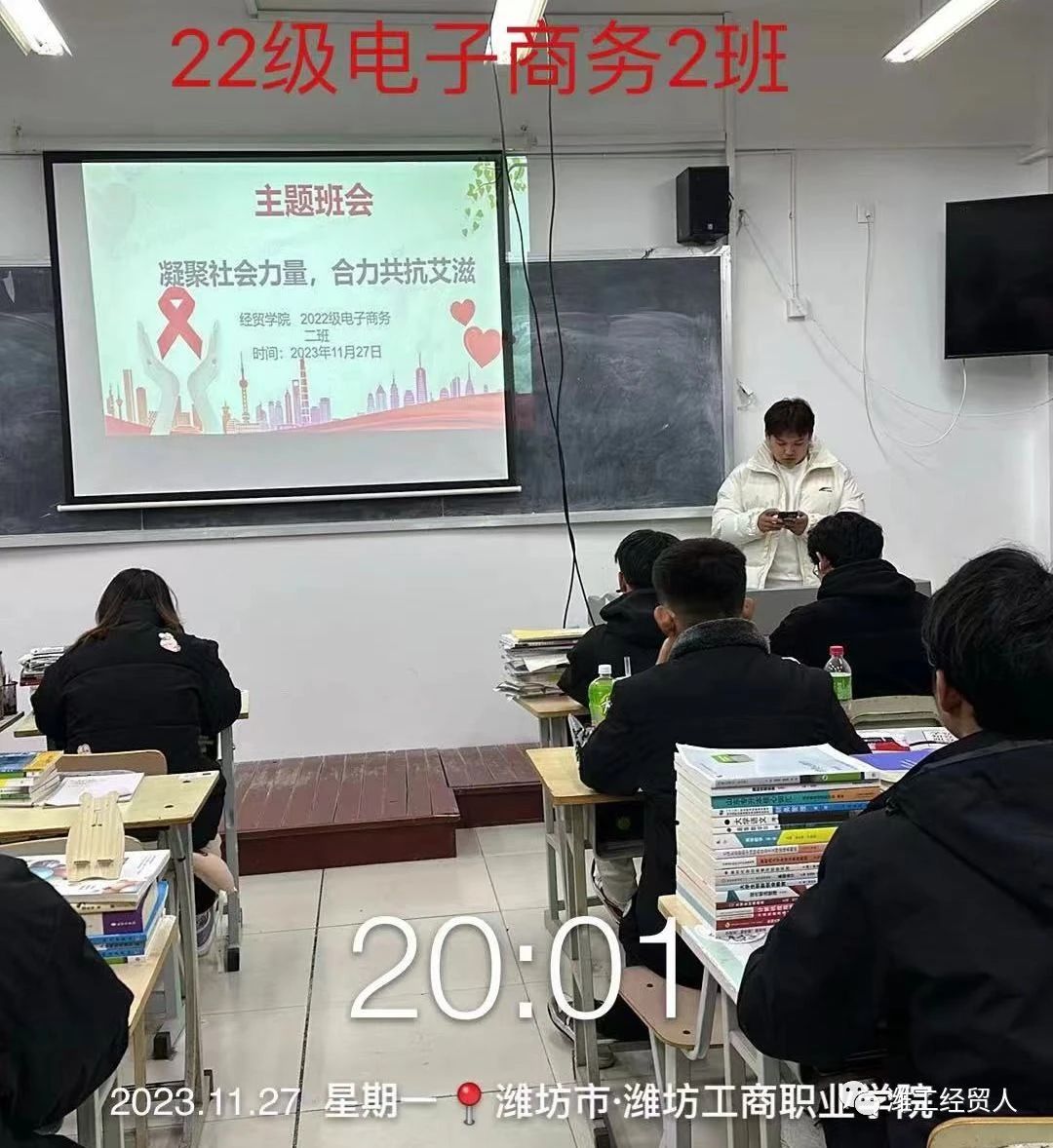 为响应世界艾滋病日的号召,积极参与艾滋病防治工作,同时提高同学们对艾滋病的认知和防范意识,倡导健康的生活方式,增强自我保护意识,减少对艾滋病人的歧视和偏见,并营造和谐的校园环境,2023年11月27日下午,潍坊工商职业学院经贸学院举办了防艾主题班会,此次班会意在呼唤大家学会正确地保护自己,唤起同学们对艾滋病毒感染者的同情及理解,呼吁大家关爱他人,共享生命!