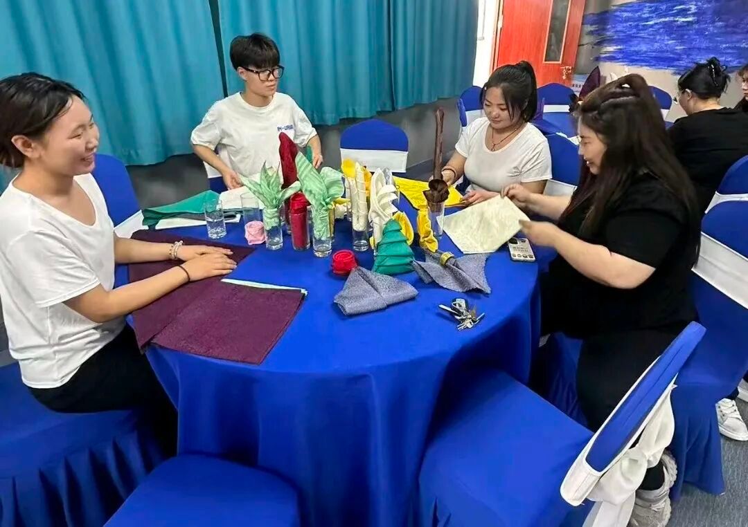 中餐摆台讲究 “礼仪对称”,圆桌之上,骨碟、筷子等餐具紧凑有序,主位正对门庭彰显尊荣,餐巾折花如灵动羽翼,寓意吉祥如意;西餐摆台尽显 “分餐优雅”,长桌之间,刀叉按序陈列,女主人居首端掌控全局,几何造型餐巾简约大方,水杯如星辰点缀其间。一场摆盘展示,半部文化简史,中西餐饮礼仪的差异在此碰撞出迷人火花,让用餐成为跨越时空的文化对话。