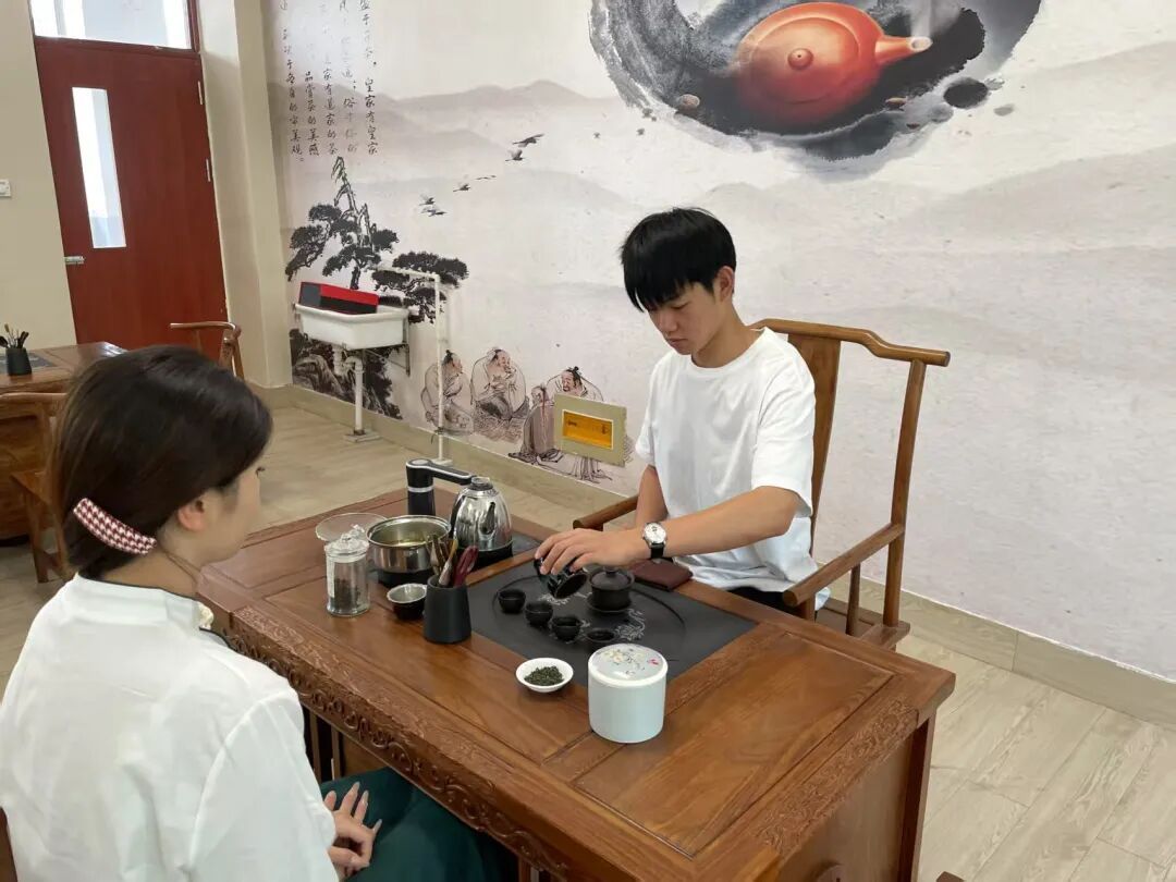 茶艺室里,原木桌椅与青瓷盖碗相映成趣,“知行合一,以茶修身” 的理念贯穿教学始终。同学们执壶注水,温杯烫盏间如行云流水,茶汤澄明似琥珀凝光,举手投足尽显东方雅韵。从识茶、泡茶到奉茶,每一个步骤都是对千年茶道的致敬,每一缕茶香都是对匠心精神的诠释,让传统茶文化在现代职教课堂中焕发出新的生机。