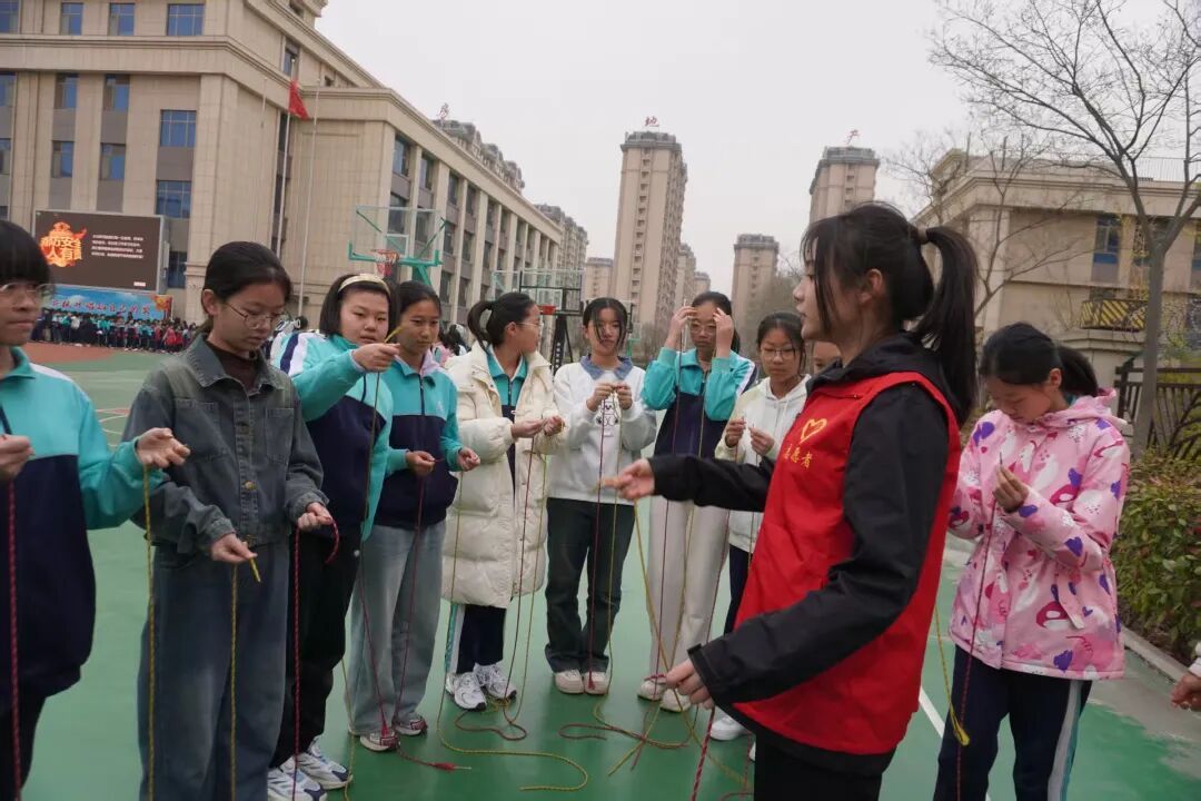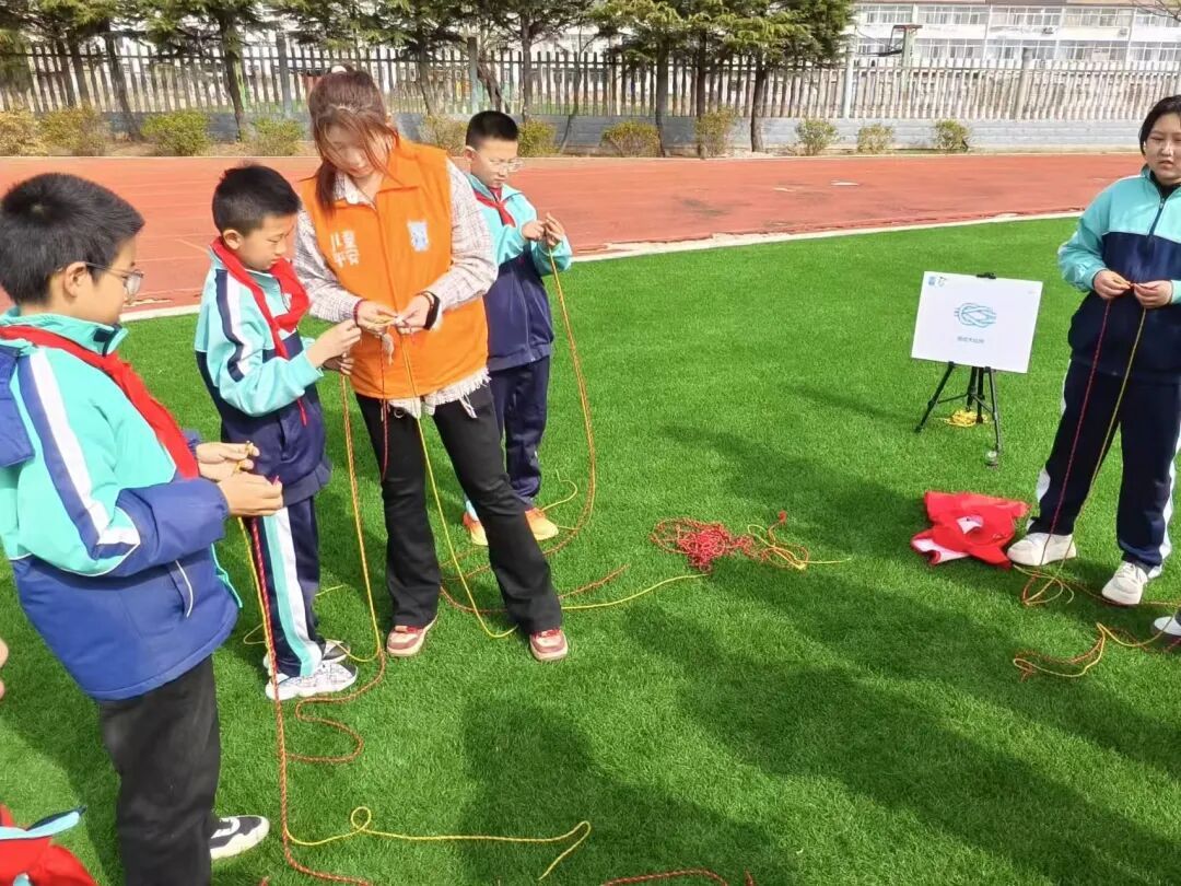 活动中志愿者们给小朋友亲身示范单套结、双平结的结绳方法,介绍两种绳结的特点和在急救中的使用方法,直到大家都能熟练的掌握结绳方法,学会在地震发生后或火灾时利用结绳的方法迅速逃生。