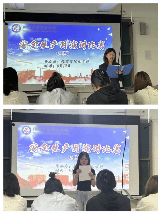为深化活动成效,经贸学院创新开展安全生产主题演讲比赛。比赛现场,选手们围绕"人人讲安全、个个会应急"主题,结合校园生活与社会热点,从消防安全、实验室安全、家庭用电安全等多个角度,以生动的语言、鲜活的案例和饱满的情感,声情并茂地讲述安全知识的重要性,呼吁全体师生重视安全问题。选手们精彩的表现不仅展现了经贸学子的青春风采,更通过演讲的感染力,让安全知识"活"起来,推动安全理念在全院范围内广泛传播。