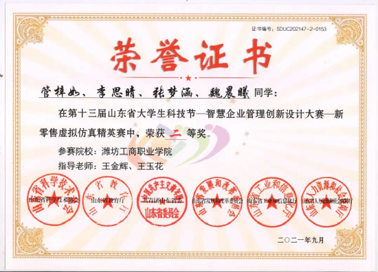 学院教科研水平高,自主开发的校本教材13部,拥有山东省优秀教学团队一个、山东省精品课程群一个、山东省高水平专业群1个,山东省特色品牌专业群1个,山东省职业教育精品资源共享课4门、潍坊市职业院校高水平专业群1个、潍坊市电子商务现代产业学院1个。在各级学生技能比赛中获得国家级一等奖2项,三等奖2项、省级一等奖5项、二等奖三等奖若干。学院有4个1+X证书制度试点;40余个校内外实习实训基地。毕业生综合素质高、实践能力强,用人单位评价高,在全国、全省职业院校技能大赛中屡创佳绩。