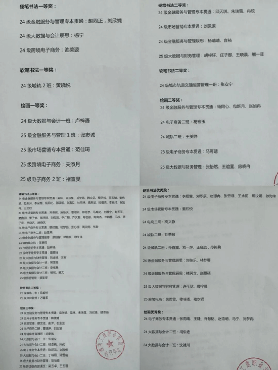 硬笔之刚、软笔之韵、绘画之情——虽艺术形式各异,却共同奏响一曲气壮山河的强军赞歌。三类作品交相辉映,构成一场多维度的审美体验与精神洗礼。它们相互呼应、彼此成就,形成整体性的震撼效果,充分彰显了我校学子以艺术致敬英雄、以创作弘扬正能量的深厚情怀与责任担当,展现了新时代青年对强国强军事业的深刻理解与坚定支持。此次创作不仅是一场艺术展示,更是一堂生动的爱国主义教育课,一次震撼心灵的精神洗礼。书画社将继续秉持"墨香传正气,笔刃绘军魂"的初心,为传承红色基因、弘扬强军和优秀精神贡献艺术力量,用笔墨丹青继续书写强军兴军的壮丽篇章。本次书画大赛圆满结束,大赛提交作品数量众多且质量之高,一等奖以7%的比例优中选优,二等奖以14%的比例脱颖而出,并另外设有三等奖奖,获奖名单如下: