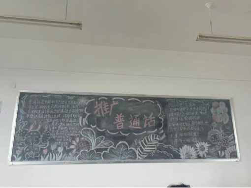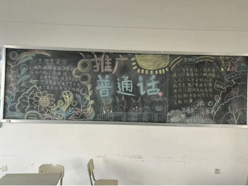 班级是推普宣传的重要阵地。各班级以“推广普通话”为核心,精心设计黑板报:有的用生动漫画科普普通话小知识,有的以手抄报形式展示经典诗文,有的则通过“普通话小笑话”“易错字辨析”等趣味板块,让规范用字知识变得通俗易懂。一块块色彩鲜明、内容详实的黑板报,不仅成为班级文化建设的亮眼风景,更让同学们在创作与观赏中加深了对“说好普通话、用好规范字”的认识,营造了“人人说普通话”的班级氛围。