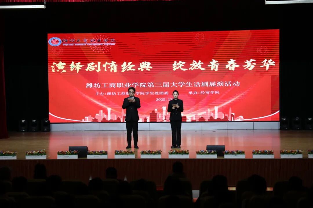 12月3日下午,由潍坊工商职业学院学生处团委主办,经贸学院承办的"演绎剧情经典 绽放青春芳华”第三届大学生话剧展演活动在第一报告厅成功举办。学校学生处处长 团委书记柴元昌,经贸学院党支部书记谢瑞凤及各二级学院的评委老师莅临此次展演活动现场。