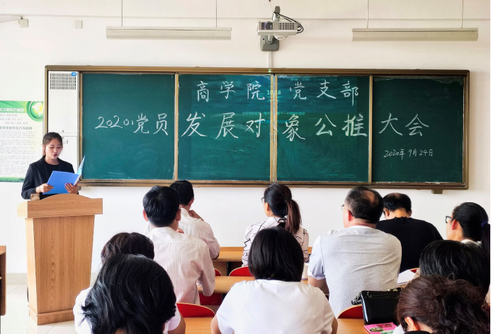 为了把控发展对象的质量,全面深入了解预发展对象的思想状况、学习状况以及生活状况,2020年9月24日,商学院党支部在尚文楼410教室召开“2020年党员发展对象公推大会”。潍坊工商职业学院党委委员陶炳勇同志、商学院党支部8名党员及31名教师和学生代表参加了此次公推大会。