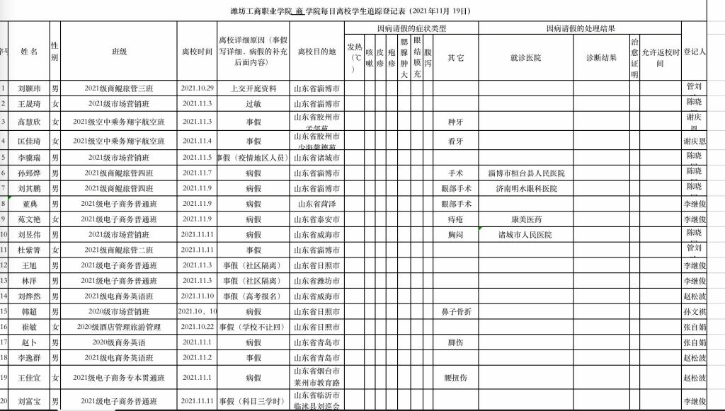 潍坊工商职业学院商学院离校学生安全追踪表