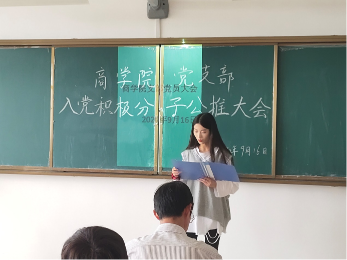 为真正把有文化,有能力,思想政治素质好,党员群众公认的优秀青年吸引到党内来,2020年9月16日下午,商学院党支部在尚文楼410教室召开“入党积极分子公推大会”。潍坊工商职业学院党委委员陶炳勇同志莅临会议现场,商学院党支部8名党员以及商学院35名教师和学生代表参与此次会议。