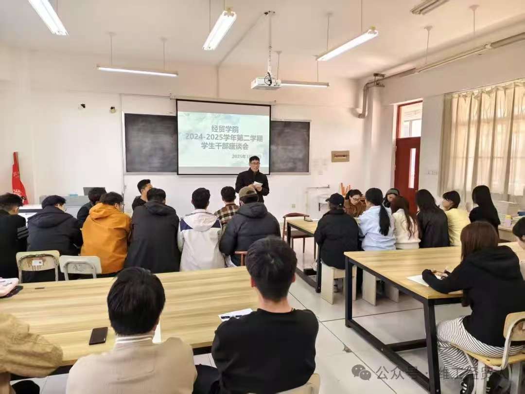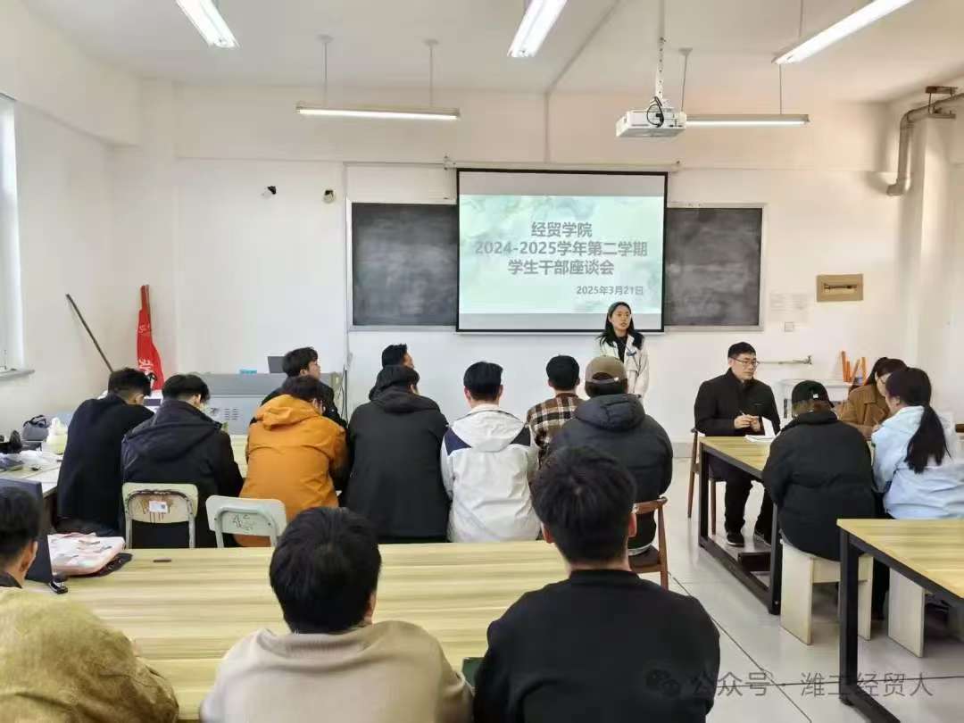 2025年3月21日,经贸学院于102党员活动室举行了2024-2025学年第二学期学生干部座谈会,学院党支部书记谢瑞凤、党支部副书记万志峰、团支部书记褚琪及各部门学生干部代表出席了此次会议