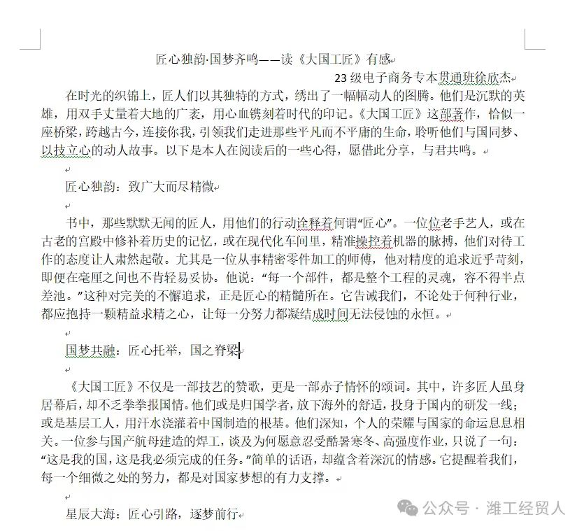知识收获:通过大家的阅读和分享,全体学生对工匠精神有了更深刻的理解。大家认识到,工匠精神不仅仅局限于日常生活中,更是现代科技发展中不可或缺的品质。