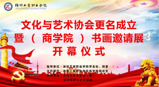 2019年11月12日下午3:00,值学院文化与艺术协会更名(原学院书画社改为文化与艺术协会)成立之际,由商学院举办庆祝中华人民共和国成立70周年系列活动“与国同庆,不忘初心”书画邀请展在潍坊工商职业学院尚文楼404室进行。