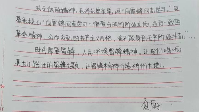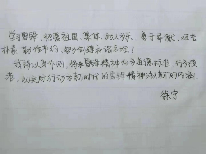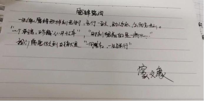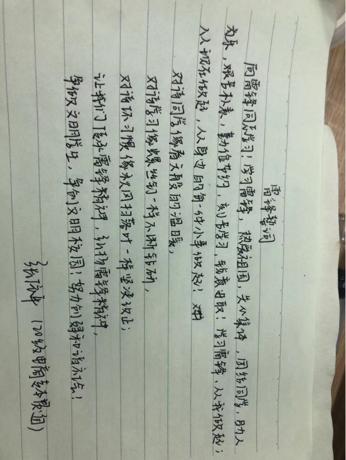为大力弘扬志愿服务精神,推动学雷锋活动常态化,提高全校师生思想道德素养和文明程度,各班同学积极书写学雷锋誓词!学习学雷锋誓词,进行宣誓,让雷锋精神在心中生根发芽。从我做起,从小事做起,从现在做起,前赴后继,踊跃争先,始终做文明言行的劝导员,先进文化的讲解员,诚实守信的宣传员,清洁卫生的服务员,绿水蓝天的守护员,和文明爱心的传递员。