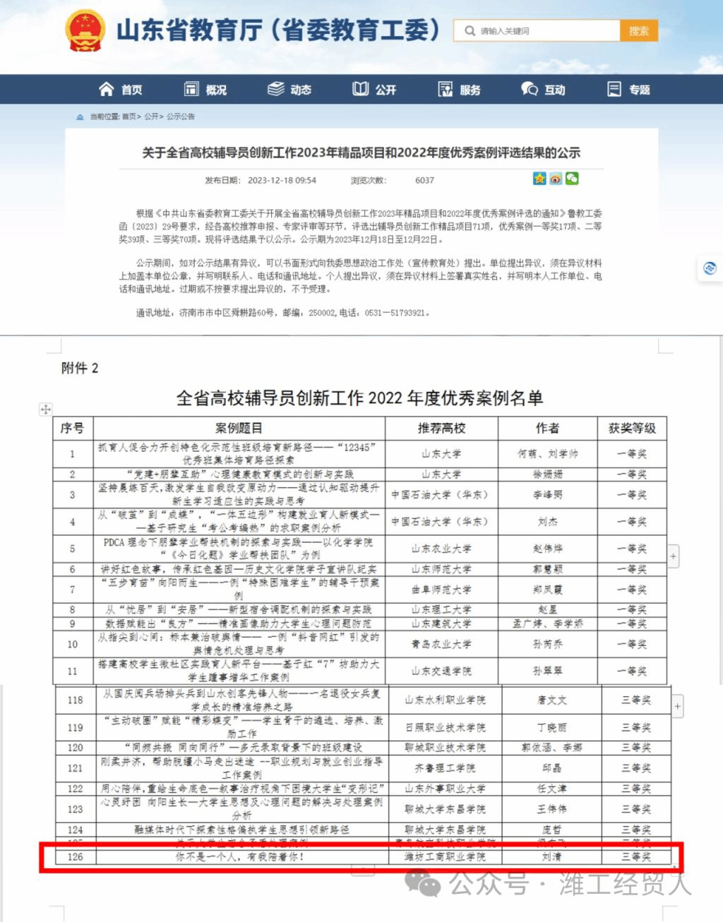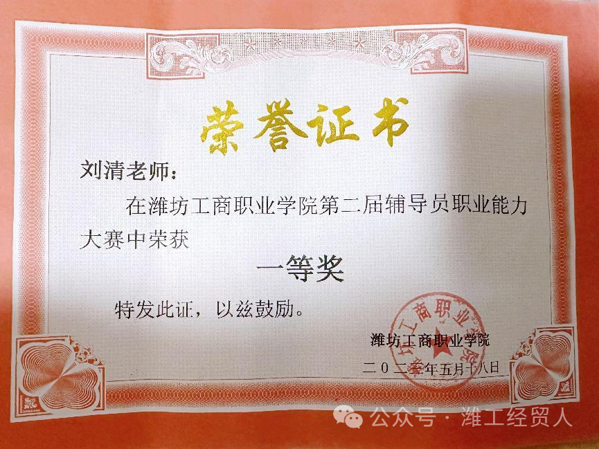 近日山东省教育厅公布了全省高校辅导员创新工作2023年精品项目和2022年度优秀案例评选结果,经各高校推荐申报、专家评审等环节,经贸学院辅导员刘清老师《你不是一个人,有我陪着你!》荣获全省高校辅导员创新工作2022年度优秀案例三等奖。作为一名入职未满两年的专科院校辅导员来说获得此奖项值得认可!