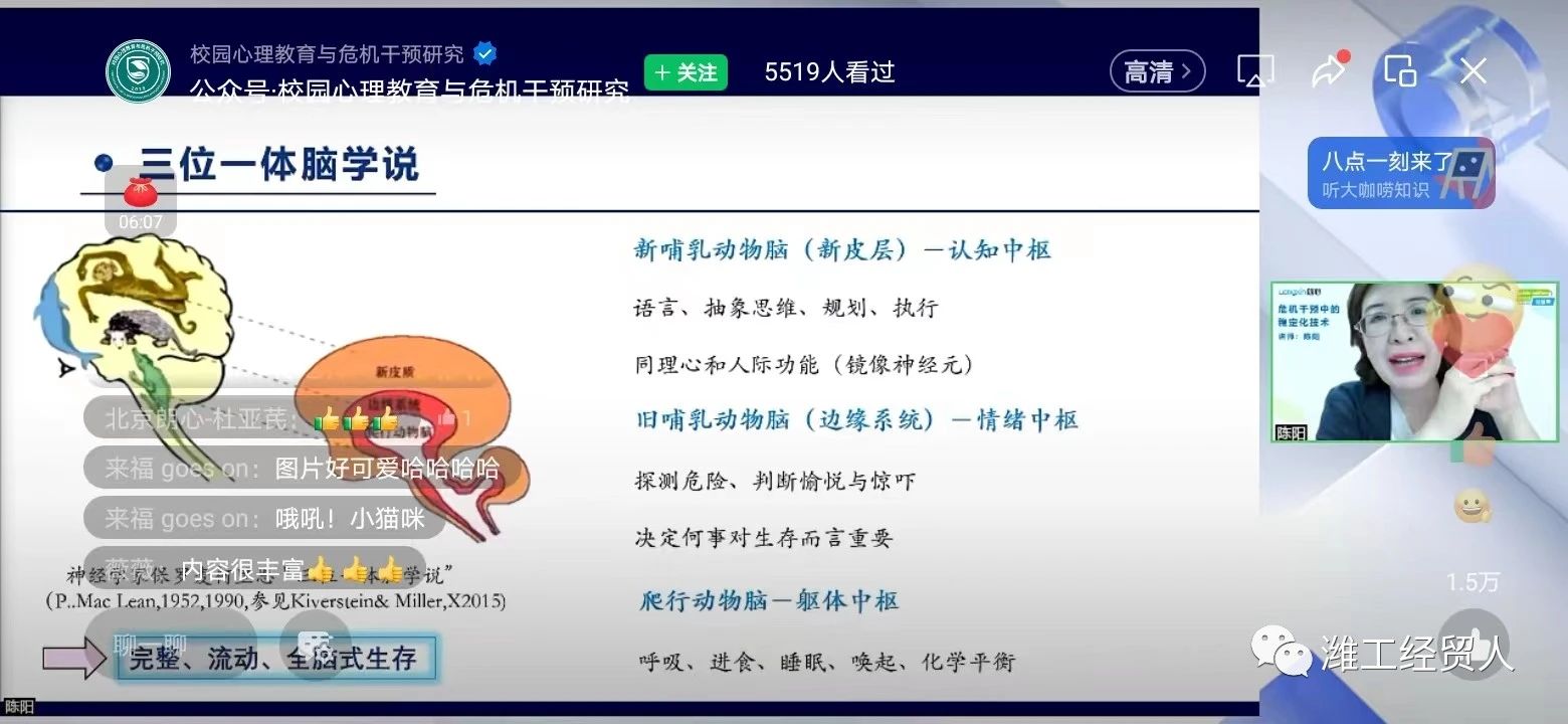 在心理教育的问题上,来不得半点麻痹和侥幸,我们必须要防苑在先,警惕在前,必须警于思、合于规、慎于行;必须要树立高度的意识,人人都要注意自己的心理健康,时时讲健康,事事讲健康:必须要筑起思想,才能拥有健康的心理。世界因为有了生命而变的精彩!世界因为心灵的健康而和谐!通过观看心理专题培训,认识到心理健康教育不仅仅是提供知识,更是培养我们的情绪管理能力和人际交往能力,通过培训,学会如何认清自己的情绪,并作出有效的情绪调节方法。这些方法不仅可以帮助我们更好地应对学习和生活中的压力,也为我们未来的发展奠定了坚实