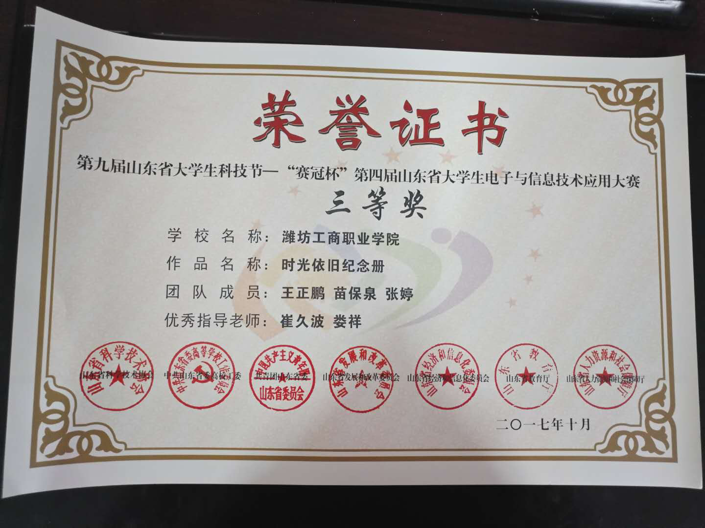 我院工商管理系15级电子商务专业三班王正鹏、苗保泉、16级经济信息管理班张婷团队申报的创业项目——《时光依旧纪念册》,在崔久波、娄祥老师的精心指导与帮助下,历经初赛、复赛、决赛等环节,面对各路创业、创意精英,面对各类优势创业项目,参赛团队沉着应战,精心准备,取得了总决赛三等奖的战绩,同时我系16级经济信息管理班魏旭晖、侯雯娟、徐艳婷团队参赛的《多功能定位轮椅》项目也取得优秀奖的好成绩。
