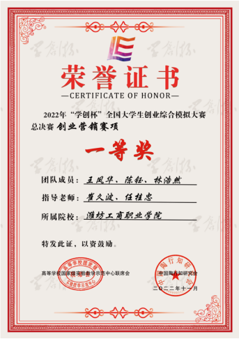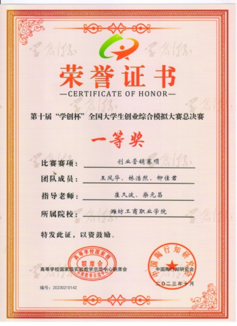 2022年11月在“学创杯”国赛创业营销赛项总决赛中,由崔久波、任桂忠指导的团队获得国赛一等奖。2023年第十届“学创杯”全国大学生创业综合模拟演训活动创业营销赛项总决赛在南京审计大学举行。经过国赛总决赛的激烈角逐,由我校21级电子商务专本贯通班的王凤华、林浩然、柳佳君三名同学组成的代表队,以优异的成绩获得创业营销赛项总决赛一等奖,为学校争得了荣誉。大赛充分展示了经贸学院创新创业教育方面的成果,推动创业实践教学,切实提高学生的创新创业能力,真正做到了以赛促教、以赛促学、以赛促创。