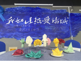 图2 学生餐巾折花作品(左)和“博学善思”主题的摆台(右)。
